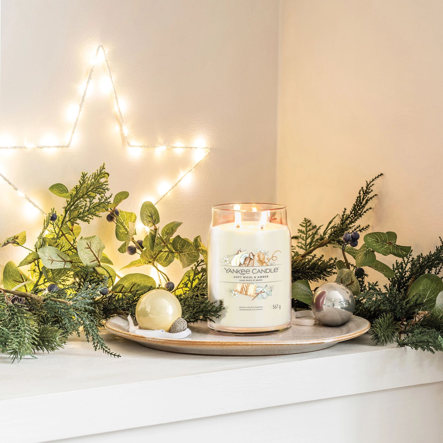 Soft Wool & Amber The fragrance notes are as follows: Top: Heliotrope, Orange, Tangerine Mid: Lily of the Valley, Jasmine Base: Musk Flower, White Amber, Cashmere, Sandalwood, Vanilla Wrap yourself up in a cosy hand-knit throw and relax surrounded by the scents of white amber, jasmine and cashmere. Experience the Yankee Candle« brand, totally reimagined. This refreshing take on our iconic Jar shape is designed to create the best experience to date. This is the largest Jar Candle in the collection at 567g. Two wicks and a premium soy-wax blend provide beautiful ambiance. Hand-illustrated labels and vibrant wax colours are perfectly matched with our Signature exclusive and tried-and-true fragrances to create an inspired addition to your home.