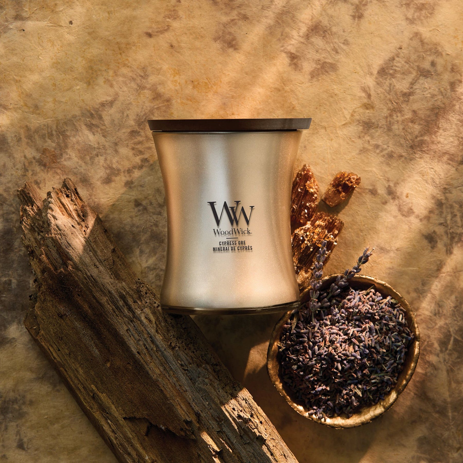 Discovered deep within the earth, gleaming troves of pure gold, shimmering caches of silver, and precious mixed metals - nature's rarest materials inspire the elegant finish of this richly fragrant WoodWick Collection. Indulge .. and bring home the world of luxury of the natural world. With fragrance notes of Pink Pepper, Lavender, Patchouli and White Amber